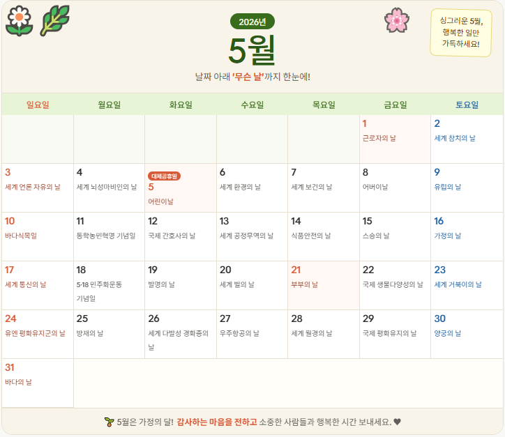 - 새롭게 추가: 노동절(5월 1일), 제헌절(7월 17일)